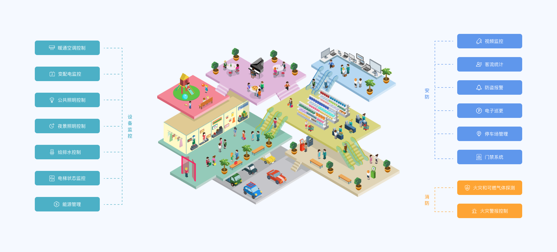 3、綠色節能智慧化(huà):依托智能化(huà)能耗設備的(de)數據實時(shí)采集和(hé)感知,設置設備的(de)聯動用(yòng)能,實現人(rén)走電燈滅,人(rén)走空調關,定時(shí)公區(qū)啓用(yòng)節能模式等,實現綜合體運行的(de)節能減排,并通(tōng)過交流電過零點技術實現對(duì)配電設備的(de)安全啓停,預防電氣火災實物(wù)的(de)發生。